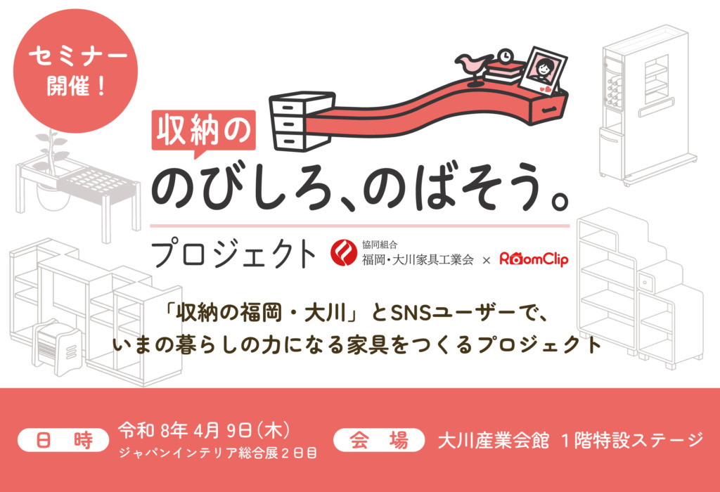 「収納の福岡・大川」が、暮らしのSNS「RoomClip」と取り組む、いまの暮らしの中にある収納の課題に取り組むプロジェクト「収納ののびしろ、のばそうプロジェクト」。本イベントでは、いま大川がSNSトレンドに向き合う理由、その中でトライが始まったユーザーとの家具づくりの現状・成果について報告。見えてきた新たなユーザーニーズの手がかりをご紹介します。